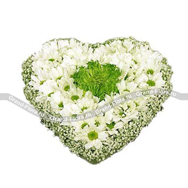 Сердце ангела - композиция на оазисе в виде сердца из хризантемы и гипсофилы