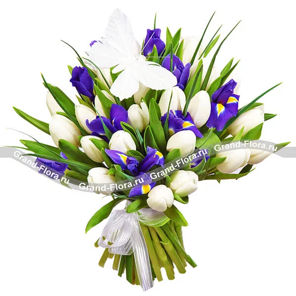 Стандартный: тюльпаны - 6 шт., ирис - 5 шт., декоративная зелень, бабочка белая (декоративная).