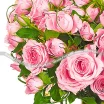 Уменьшенный: роза кустовая розовая - 5 шт, декоративная зелень, упаковка, лента розовая. Примерный размер: 20Х20 см.