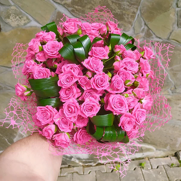 Стандартный (на фото): роза кустовая розовая - 9 шт, декоративная зелень, упаковка, лента розовая. Примерный размер: 25Х25 см.