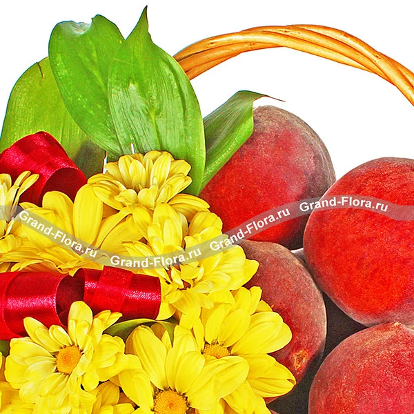 Уменьшенный: хризантема желтая кустовая - 1 шт., рускус - 2 шт., оазис, сетка, красная лента, корзина малая, персики - 1 кг.