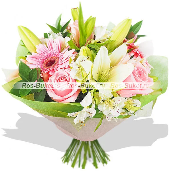 Стандартный (на фото): гербера розовая - 3 шт, лилия белая - 2 шт, роза розовая - 7 шт, альстромерия белая - 4 шт, рускус, фетр зеленый.