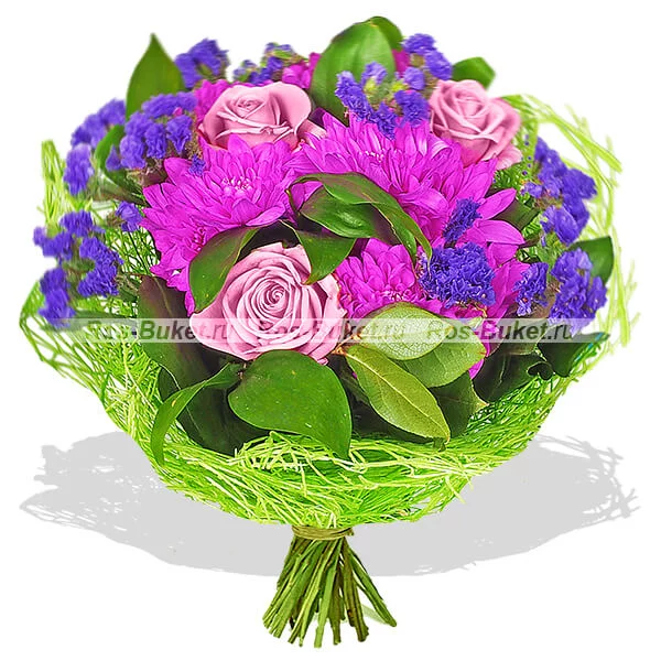 Стандартный (на фото): роза розовая - 3 шт, хризантема кустовая розовая (малиновая) - 4 шт, статица - 3 шт, салал, натуральная сетка (зеленая).
