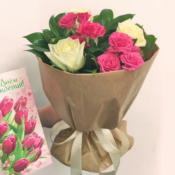 роза белая - 15 шт., роза кустовая розово-белая (возможна замена на розовую/малиновую) - 8 шт., декоративная зелень, упаковка крафт, лента кремовая. Примерный размер: 35Х35 см.