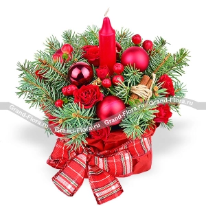 Стандартный: роза белая - 5 шт., эустома белая - 2 шт., роза кустовая белая - 1 шт.,ель, мандарины - 1 кг., шишки - 2 шт., оазис, коробка.