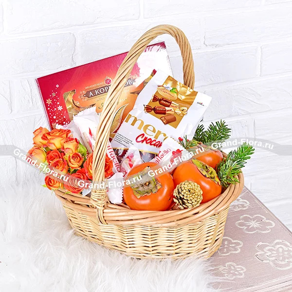 Сладкий праздник - корзинка с хурмой, розами и сладостями