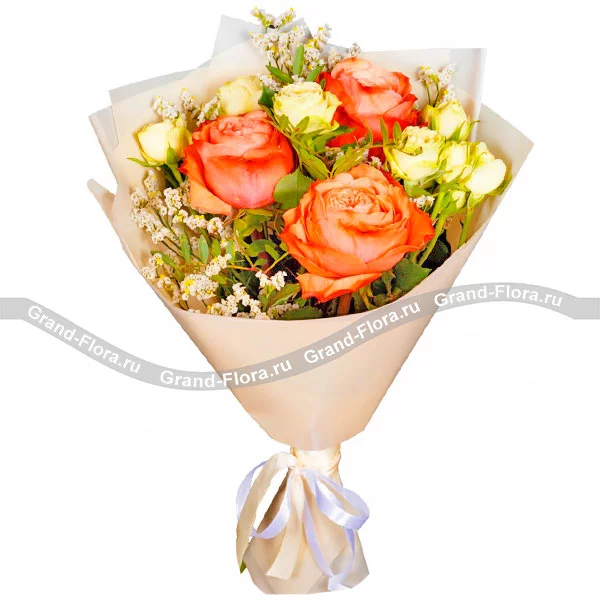 Хотите подарить яркие эиоции тому, кто дорог? Закажите букет "Апельсиновый джем" с доставкой на дом или в офис! Получателя приятно удивит сочетание оттенов! В этом букете оранжевые одноголовые розы гармонично сочетаются с кремоввми кустовыми, а нежная гипсофила придает воздушность и легкость композиции. Букет станет приятным комплиментом, знаком внимания и безусловно, наполнит день получателя радостью!