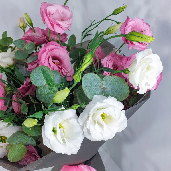 Стандартный: эустома розовая - 7 шт., эустома белая - 4 шт., декоративная зелень, упаковка крафт, лента розовая.