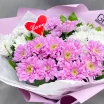 5 хризантем: хризантема кустовая белая - 3 шт., хризантема кустовая розовая  - 2 шт.,  декор сердечко , упаковка, лента
